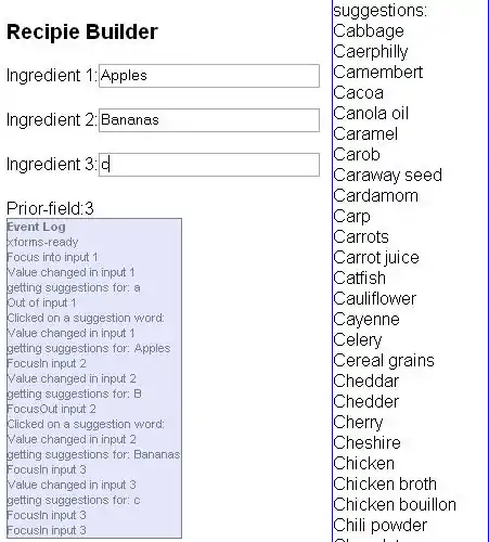 The following example shows that as the user types in the letter "c", a list of possible ingredients instantly appears in the right column. The user can continue typing and the list will be restriced to the suggestions that start with the letters typed. When the user selects an item it will fill in the prior selected field.