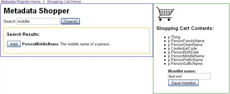 Here is a sample screen image showing the shopping cart after several metadata elements have been added to it.