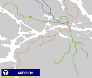 Åkeshov is a station on the Green line of the Stockholm metro. It is located in the borough of Bromma in the west of the city of Stockholm. The station is at ground level, has two island platforms flanking three through tracks, and is one of the intermediate termini along the northern section of the Green line, with line 17 trains normally terminating. Access is by way of a pedestrian underpass that passes under both the metro line and the adjacent Bergslagsvägen street.[2][3][4]
