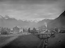 The area where the station is located is built on reclaimed land, as the Åndalsnes side of Isfjorden is sufficiently shallow. The earthwork for the reclaiming was taken from a cutting built to allow the line access to Åndalsnes. The earthwork was transported using temporary 90 and 60 centimetres (35 and 24 in) gauge railways.[1] In 1912, tests were done in the area of the cutting to establish if it should be a cutting or a tunnel. Work with excavation started in 1915,[2] with the cutting up to 16 meters (52 ft) deep.[3] It was necessary to move one house to make room for the line through Åndalsnes.[4] The station building was built in 1923 and 1924, and had an area of 316.2 square meters (3,404 sq ft). It cost 254,836 kr to build.[5] Both the main station building and the auxiliary buildings were designed by Gudmund Hoel of NSB Arkitektkontor, the in-house architecture firm for the Norwegian State Railways, who were responsible for construction.[6]