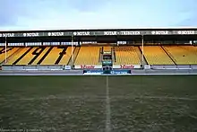 Åråsen Stadion has a capacity of 12,250 spectators, all seated.[14] The stadium consists of four single-tier stands.[15] The western stand is the main stand, with the upper section consisting of luxury boxes and club seating for 700 people.[15][16] For sponsorship reasons it is known as the Lillestrøm Torv Stand, after a local shopping center. The southern part of the East Stand houses the Kanarifansen, the official LSK supporters' group, while the northern part has unreserved seating. The South Stand is named for Romerikes Blad, the local newspaper, while the North Stand is named for Legea, a sportswear manufacturer.[15] The latter is used for away fans.[17] The stadium is owned by Åråsen Stadion AS, which is again wholly owned by Lillestrøm SK. Operation of the venue's commercial properties is done by Åråsen Eiendom AS, which is owned 75 percent by Åråsen Stadion and 25 percent by Lillestrømbanken.[12] The stadium is within walking distance of both the town center of Lillestrøm and Lillestrøm Station.[18] Lillestrøm SK hold their training sessions in the nearby Lillestrøm Stadion and LSK-Hallen.[19][20]