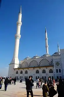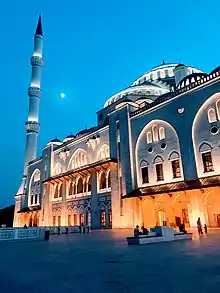 Currently the largest mosque in Turkey, the Grand Çamlıca Mosque (Turkish pronunciation: [tʃamlɯdʒa]) (Turkish: Büyük Çamlıca Camii) is a landmark complex for Islamic worship which was completed and opened on 7 March 2019.[1] The mosque stands astride Çamlıca Hill in the Üsküdar district of Istanbul and is visible from much of the centre of the city. The complex incorporates an art gallery, library, and conference hall.[2] It can hold up to 63,000 worshippers at a time (can accommodate up to 100,000 people in case of an earthquake).[2]