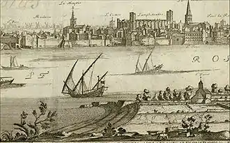 The church was abandoned around 1618 because the local inhabitants thought it was too far from the village[5] because it had been moved upstream when the boat bridge was moved. The church was still known under the name of "Saint-Pierre-le-Vieux".[6] It was then demolished in 1786[7][8] and razed entirely in 1872; its stones were used to build an enclosure around the cemetery which marks its site.[1]