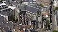 Following the siege of Nantes by Louis XI in 1487, Bishop Peter of Chaffault, repaired and enlarged the basilica Building it in the form of a Latin cross. The apse is Merovingian but the nave was extended towards the west, and flanked by two crosses. The bell tower to the west, raised 1.20 meters above street level measured 32.43 m high and consisted of: a square tower with a height of 17.30 m and an area of 30 m2, supported by buttresses and decorated with narrow basket-handle windows to illuminate the staircase; a wooden belfry in the form of 3,50 m high needle; a pavilion with a height of 6.05 m; a slate arrow of 3.48 meters high topped by a ball and a cross with a height of 2 meters [1].