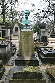 In London, General Eudes, as he was known, lived in poverty. He took part in some of the affairs of the First International and once received a letter from Karl Marx.[1] A general amnesty for Communards in 1880 enabled him to return home. He resumed his political activities. He contributed to the Blanquist journal Ni Dieu ni Maître (Neither God nor Master) and co-founded L'Homme Libre (The Free Man) with Édouard Vaillant. He became a member of the Blanquist Central Revolutionary Committee, founded in 1881. On 5 August 1888, Eudes was holding a particularly vehement speech at a meeting at the Salle Favié, when he suffered a cerebral haemorrhage due to an aneurism and died. He was buried at the Père Lachaise cemetery. His grave stone includes a bust of him.