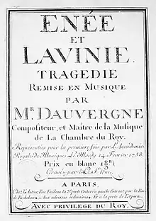Énée et Lavinie (Aeneas and Lavinia) is an opera by the French composer Antoine Dauvergne, first performed at the Académie Royale de Musique (the Paris Opéra) on 14 February 1758. It takes the form of a tragédie lyrique in five acts.