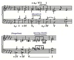 Like all of Chopin's other études, this work is in ternary form A–B–A. The strict periodic structure contains eight-bar periods—two in the A section, forming a regular 16-bar period, three in the middle one and in the final A section a single eight-bar period expanded by five bars.[7] The harmonic relationships in the first eight bars, marked by a deceptive twist to bar 4 and a Neapolitan chord in bar 7, are shown in a harmonic reduction.[8] Bars 9–16 repeat the same progression, ending with an E minor perfect cadence.