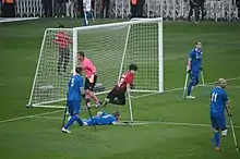 Ömer Güleryüz (red/black) scoring a goal for Turkey in the 2017 European Amputee Football Championship final match against England.