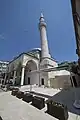 The minaret is adjacent to the right side of the portico wall. It is entered through a door inside the portico. Built in ashlar, it sits on a square-plan base and has a polygonal-formed shaft. It has one balcony with muqarnas underpart. Under the balcony, a red-colored stone belt winds round. The minaret's spire has been restored.[1]