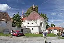 The most important monument is the pilgrimage complex with the Church of the Holy Spirit and Loreto Chapel of Santa Casa. The centre of the area is the Loreto chapel, surrounded by ambits with baroque and rococo wall paintings and a set of lunette paintings that depict important pilgrimage sites in the Czech Republic. The Church of the Holy Spirit was built in the early Baroque style in 1697. A tall prismatic belfry was added to it in 1891. The pilgrimage complex is protected as a national cultural monument.[6]