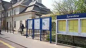 Żyrardów railway station is a railway station in Żyrardów, Poland. The station is served by Koleje Mazowieckie (who run trains from Skierniewice to Warszawa Wschodnia), PKP Intercity (TLK and IC services), and Przewozy Regionalne (InterRegio services). It was opened in 1845 as part of the Warsaw–Vienna railway.