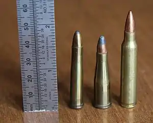 .22 Remington Jet (center) with .22 Hornet (left) and .223 Rem (right).