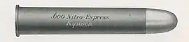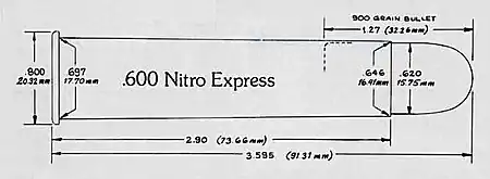 The .600 Nitro Express is a slightly tapered walled, rimmed, centerfire rifle cartridge designed for use in single-shot and double rifles.[4]