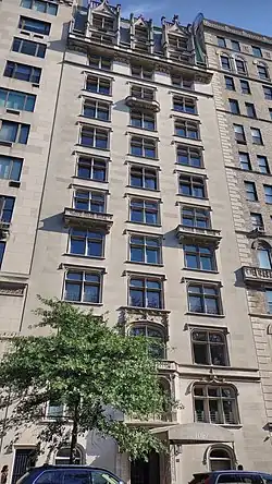 The 50-by-100-foot (15 by 30 m), 12-story building was designed in the Châteauesque style by C. P. H. Gilbert and completed in 1917, becoming only the second luxury residential building to be erected on Fifth Avenue (after McKim, Mead & White's 998 Fifth Avenue, which was completed in 1912). It was built by the 1067 Fifth Avenue Company, who obtained a $500,000 mortgage from Hanover Mortgage Company in 1915.[1] The building is the Upper East Side's only example of the Châteauesque style applied to a high-rise.[2] At the time of its construction, it was flanked by private homes, including one that belonged to Henry Phipps Jr.,[3] who had "declined to buy the empty land to the north".[4]