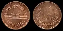 The first ten yen coins made after World War II were authorized by law on March 2, 1950, by prime minister Shigeru Yoshida. These coins were to be made of German Silver, and act as "temporary subsidiary coins".[23] A total of 432,970,000 ten yen coins minted in this new alloy were recorded as struck by the end of that year. By the end of 1951 almost 800 million of these coins had been minted and were waiting to be distributed.[24][25] None of the German silver coins minted between 1950 and 1951 ever circulated as the coins were eventually melted. The decision to melt the coins came as the Korean War had driven nickel prices to about 4.1 million yen per ton.[26][27] Those that escaped being melted and are now considered by collectors to be "scarce" Japanese pattern coins.[28][29] Bronze ten yen coins were first minted in 1951, but were not released for general circulation until January 4, 1953.[30] Ten yen coins minted between 1950 and 1958 have reeded edges and are nicknamed Giza 10 (Giza Ju, ギザ10), meaning “jagged 10 yen coin” in Japanese.[31] The design which is used today features Phoenix Hall of Byōdō-in on the obverse, and Bay laurel leaves on the reverse. The design remains essentially the same other than the reeds being dropped in 1959 which gave the coins a smooth edge. Slight modifications were also made in the latter half of 1986 regarding the design of Byōdō-in.[31] These coins are not culturally recommended as shrine offerings as another word for "10" is "toh" (十), and another word for "yen" is "en" (円). Combining these characters into "toh-en" can also read as "far destiny" (遠縁).[32] Ten yen coins continue to be produced up to the present under the Reiwa era.