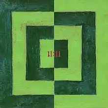The album's title is a palindrome, and its cover artwork depicts the title superimposed between squares; both concepts reflects the band's long-held interest in symmetry and geometry. While previous Pinegrove album artwork follow primary colors (according to a color wheel), the sleeve of 11:11 marks a move towards secondary colors, in this case green. Hall adopted the concept from fans speculating online in the lead-up to the album's release, recognizing that it creatively worked within themes the album already explores, namely the climate crisis.[6] Madeline Crone at American Songwriter felt that the visual of the title itself evokes a row of pine trees.[5]
