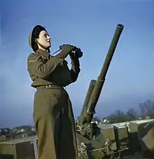 By 1941, after two years of war Anti-Aircraft Command, tasked with defending the UK against air attack, was suffering a manpower shortage. In April its commander-in-chief, Lieutenant-General Sir Frederick 'Tim' Pile, proposed to overcome this by utilising the women of the Auxiliary Territorial Service (ATS). The ATS was by law a non-combatant service, but it was decided that Defence Regulations permitted the employment of women in anti-aircraft (AA) roles other than actually firing the guns. They worked the radar and plotting instruments, range-finders and predictors, ran command posts and communications, and carried out many other duties. With the increasing automation of heavy AA (HAA) guns, including gun-laying, fuze-setting and ammunition loading under remote control from the predictor, the question of who actually fired the gun became blurred as the war progressed. The ATS rank and file, if not always their officers, took to the new role with enthusiasm and 'Mixed' batteries and regiments with the ATS supplying two-thirds of their personnel quickly proved a success.[1][2][3][4]