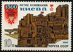 The 1500th anniversary of Kiev, the capital of the Ukrainian SSR, was commemorated in 1982.[1][2][3] Although archaeologists have found evidence that Kiev (present-day Kyiv) was founded in either the 6th or 7th century, and the settlement may have been mentioned in documents more than two millennia ago, the observance of the 1500th anniversary in 1982 is based on a now traditional founding date of 482 for the city.[4][5]