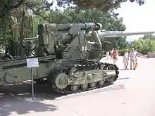 152 mm gun M1935 (Br-2) (Russian: 152-мм пушка обр. 1935 г. (Бр-2)) was a Soviet 152.4 mm heavy gun, produced in limited numbers by the Barrikady Plant in Stalingrad in the late 1930s. The most unusual feature of the gun was its tracked carriage, shared by a number of Soviet heavy artillery systems of the interwar period. Despite a number of drawbacks, most notably limited mobility and short service life of the barrel, the weapon was employed throughout the German-Soviet War; an upgraded variant with wheeled carriage, Br-2M, remained in service at least until the 1970s.