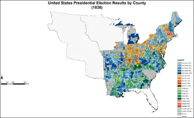 Source (Popular Vote): Leip, David. "1836 Presidential Election Results". Dave Leip's Atlas of U.S. Presidential Elections. Retrieved July 27, 2005. Source (Electoral Vote): "Electoral College Box Scores 1789–1996". National Archives and Records Administration. Retrieved July 31, 2005.
