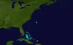 The final tropical cyclone of the season was observed by the Santa Martha early on October 22,[2] while located about 355 mi (570 km) east-northeast of the Abaco Islands.[4] Based on reports from several ships,[2] it quickly moved northward and intensified into a Category 1 hurricane by midday on October 23. Around that time, the hurricane peaked with maximum sustained winds of 80 mph (130 km/h). The storm moved rapidly east-northeastward and was last noted about 180 mi (290 km) south-southwest of Sable Island late on October 24.[4]