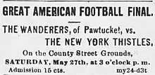 The New York Thistles, the previous year's runner up, entered the final undefeated in the season with 17 wins and two tie games, boasting 123 goals scored and 15 against. The Pawtucket Free Wanderers, along with making their first American Cup final appearance, had won the New England League three weeks prior, finishing in first ahead of the East Ends, Olympics, Rovers, and Clippers of Fall River and the New Bedford Rovers.