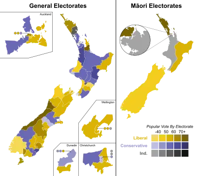 The following table gives party strengths and vote distribution according to Wilson (1985), who records Maori representatives as Independents prior to the 1905 election.[3]
