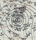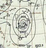 The hurricane turned northeastward on September 12 and began to accelerate. Early on September 13, it passed very close to Bermuda, with a minimum barometric pressure of 939 mbar (27.7 inHg) observed on the island.[2] Cedar trees were uprooted, while fruit and ornamental trees were swept out to sea. Some houses were destroyed, while others were deroofed. Severe damage was also reported at the naval yard and colonial government buildings. At Her Majesty's Dockyard alone, damage was "at least five figures".[10] Early on September 14, the storm weakened to a Category 2 hurricane, then to a Category 1 several hours later. Shortly after 0000 UTC on September 15, the hurricane struck the Avalon Peninsula of Newfoundland with winds of 85 mph (137 km/h). It soon became extratropical.[2] In Newfoundland, severe damage was reported at fishing premises.[10] The schooners Angler, Daisy, and Lily May either capsized or were driven ashore, resulting in 16 deaths.[11]