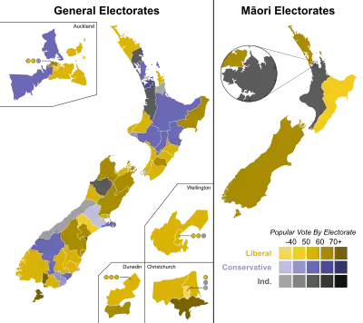 The following table gives party strengths and vote distribution according to Wilson (1985), who records Maori representatives as Independents prior to the 1905 election.[9]