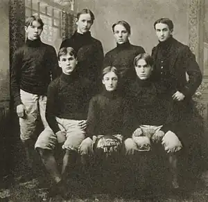 While the 1901-02 team was OAC's first school-sanctioned men's club, the sport was played competitively on campus with an admission fee charged during previous academic years.[8] A game between students took place in the school's armory on January 26, 1901 following a baseball game between commissioned and non-commissioned military officers.[8] Played before a substantial audience, the exhibition basketball game was won by a team calling itself the "White Roses" by a score of 4 to 0.[9]
