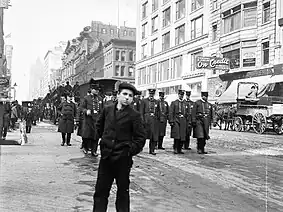 The Teamsters engaged in a sympathy strike on April 6, 1905, adding another 10,000 members to the picket lines.[2][4][5][11] Teamsters President Cornelius Shea targeted Montgomery Ward and Sears, Roebuck and Company in particular, as these were the leaders in the National Tailors' Association.[12] The sympathy strike had not occurred earlier in the year for fear it would have imperiled the candidacy of Edward Fitzsimmons Dunne for Mayor of Chicago.[13]