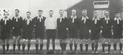 The winning team. From left: Peder Puck, Alf Flinth, Thomas Andresen, Johan Svendsen, Ole Paulsen, Otto Klein, Fritz Karlsen, Arne Andersen, Johnny Helgesen, Ole Poulsbo, Hartvig Olavesen. They are wearing some substitute textile outfits, as the "original" outfits were too old (made before the war) and there were not sufficient textiles available for making real outfits.