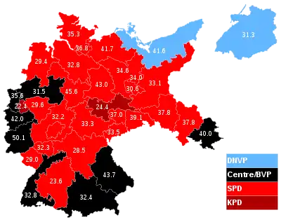 The Nazis performed best in the rural areas of Schleswig-Holstein, Lower Saxony, Thuringia, and Upper Bavaria.[9] The German National People's Party saw their support in rural Protestant areas fall from 39% to 27%.[10]