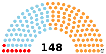 Last election 35.25%, 63 seats 47.04%, 53 seats 14.35%, 18 seats