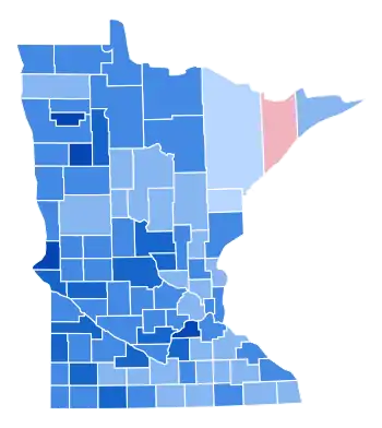This was also only the second time since statehood that the state did not support the Republican candidate, the first being when it backed Progressive Party candidate Theodore Roosevelt in 1912. Minnesota has since voted Democratic in every presidential election except 1952, 1956, and 1972, all of which were national Republican landslides. As of the 2020 presidential election, this is the last election in which Lake County voted for a Republican presidential candidate (incidentally it was the only county to vote Republican in this election) and the last election in which Carver County and Otter Tail County voted for a Democratic candidate.[1]