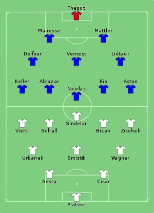 Both teams changed their usual line-ups, resting several players. Austrian players wore an unusual light blue jersey borrowed from Napoli because of the clash of colours between the two traditional jerseys. Germany took the lead inside 25 seconds with the fastest goal of the tournament, scored by Ernst Lehner. They doubled the lead with Edmund Conen, but Austria got one back immediately after with Johann Horvath. Germany's third goal came after Karl Sesta attempted to sit on the ball to ridicule a German player; the ball was stolen by Conen, who crossed to Lehner. Sesta then scored a goal, but Germany held on for the victory.[2]