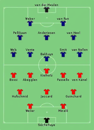 In a well-balanced game, Switzerland took the lead with Kielholz thanks to a counter-attacking play. Czechoslovakia equalized soon after with František Svoboda, who turned a chance created by Jiří Sobotka into a goal. In the second half, although Switzerland dominated the ball possession, it was Czechoslovakia scoring twice and holding on for the victory.[2]