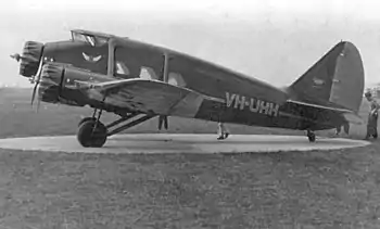The aircraft was one of three new Stinson tri-motor aircraft purchased in February 1936 for Airlines of Australia, 'said to be the most modern and luxuriously equipped and fitted 'planes operating in U.S.A. to-day'.[5] A cruising speed of 165 miles per hour (266 km/h), they could climb to 8,000 feet (2,400 m), and had retractable undercarriage, variable pitch propellers, and landing flaps. Assigned registration VK-UHH Brisbane, the others were assigned VH-UGG Lismore[note 1] and VH-UKK Townsville.[note 2]