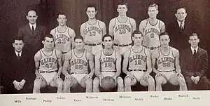 The Illinois Fighting Illini finished the season with a record of 18 wins and 5 losses. Under the direction of head coach and athletic director Douglas Mills, the Illini grouped a team of players, all around 6' 3", into a nearly undefeatable lineup later to be known as "The Whiz Kids". This group captured the attention of the entire nation while winning back-to-back conference titles and combining for a 35-6 record, 25-2 in the Big Ten over those two seasons. They dazzled crowds everywhere averaging 58 points per game, while most teams were averaging in the low 40s. Primarily made up of sophomores, they dominated the 1941-42 conference basketball season by posting a 13 – 2 record. A starting lineup consisting of Arthur "Jack" Smiley, Ken Menke, Andy Phillip, Ellis "Gene" Vance, Victor Wukovits and Art Mathisen, developed a winning attitude that would maintain for the next 15 years, a time period where the Illini would finish no less than third in the conference for 13 of them. The 1942 NCAA tournament was only in its fourth year of existence and was staged around the collegiate basketball coaches convention being held at Tulane University in New Orleans, Louisiana. The warm weather and unsufferable humidity caused the young Illini to lose two games in a period of two days.