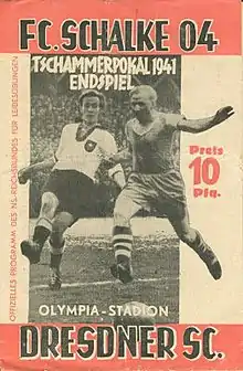 The 1941 Tschammerpokal Final decided the winner of the 1941 Tschammerpokal, the 7th season of Germany's knockout football cup competition. It was played on 2 November 1941 at the Olympiastadion in Berlin.[2] Dresdner SC won the match 2–1 against Schalke 04, to claim their 2nd cup title.