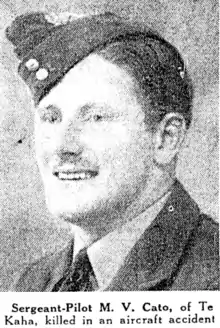 In early August it was reported that Malcolm (Mal) Vernon Cato had been killed in an aircraft accident while serving on July 16. He was 25 years of age at the time of his death. Cato had been “educated at the Te Kaha School, where his father was native schoolmaster, and then at Mount Albert Grammar School." He belonged to the North Shore Rugby Club and also played senior rugby league for Mount Albert after joining them in late 1939 and playing the 1940 season and the early part of 1941 before his departure overseas. Cato was "a keen student of the Māori language... and very popular among Māoris in the Te Kaha district. When news of his death was received, a tangi was held in his memory".[52][53] The Mount Albert senior players wore armbands as a mark of respect for their match on August 1 with Ponsonby. The Mount Albert senior players wore armbands as a mark of respect for their match on August 1 with Ponsonby.[54] At the board meeting on August 5 a “motion of sympathy was carried in silence with” his relatives.[55] Cato was buried at Beck Row (St John’s) Churchyard, Mildenhall, Suffolk, England.[56]