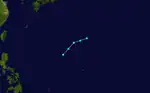 A tropical low formed to the southwest of Guam and west of Palau on April 8.[4] It moved westward over the next few days and continued to gradually deepen. Discrepancy in the location and strength of the system between Chin's Atlas and weather maps makes it difficult to pinpoint where the system went to after this point. The Chin's Atlas data set has the system moving to the north of Palau and eventually dissipating to the northeast of Catanduanes as a tropical storm on April 16.[2] Historic weather maps has the low moving straight west towards Mindanao, and curving sharply to the north on the 13. Afterwards the low strengthens to a tropical storm while paralleling the coast to the east during April 14. On April 15 the storm made landfall in Eastern Samar with a pressure below 1000 millibars.[5] Afterwards the storm weakened and moved north in response to a nearby front and stalled to the east of Luzon. An area of low pressure soon evolved to the north near Taiwan, on April 18, and moved the stalled depression to the north east. Later the system became absorbed with a cold front.[6]