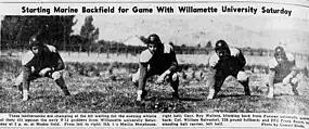 . - ↑ Paul Haines (October 2, 1944). "Willamette Navycats Romp Over Marine Eleven 33-14 In High Scoring Contest". Herald and News. p. 2 – via Newspapers.com.