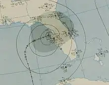 Damage from the hurricane throughout Florida was relatively minor. Citrus trees were stripped of their branches, roadways were washed out, and some telephone and power lines were toppled, temporarily severing communication.[5] Tampa recorded a record 24-hour rainfall total of 10.42 in (265 mm),[3] while precipitation peaked at 13.6 in (350 mm) in Lake Alfred.[6] Statewide, the heavy precipitation was regarded as beneficial in ending one of the worst recorded droughts there.[3] Two tornadoes were spawned; one blew a transformer off a platform and ripped a section of railing off a causeway, while both damaged some homes. Total damage reached $75,000 throughout Miami.[7] Farther north, telephone communications around Georgetown, South Carolina were disrupted, while winds gusted as high as 69 mph (111 km/h) and rainfall peaked at 5.58 in (142 mm) in Charleston.[8] In Wilmington, North Carolina, 8.24 in (209 mm) of rain was observed, causing considerable damage to the city's storm sewer system.[9] Although the core of the cyclone passed east of New England, at least 10,000 telephone lines were downed by the storm. Buildings, crops, and trees were damaged, while low visibility led to a traffic accident that killed a man in Warwick, Rhode Island.[10]