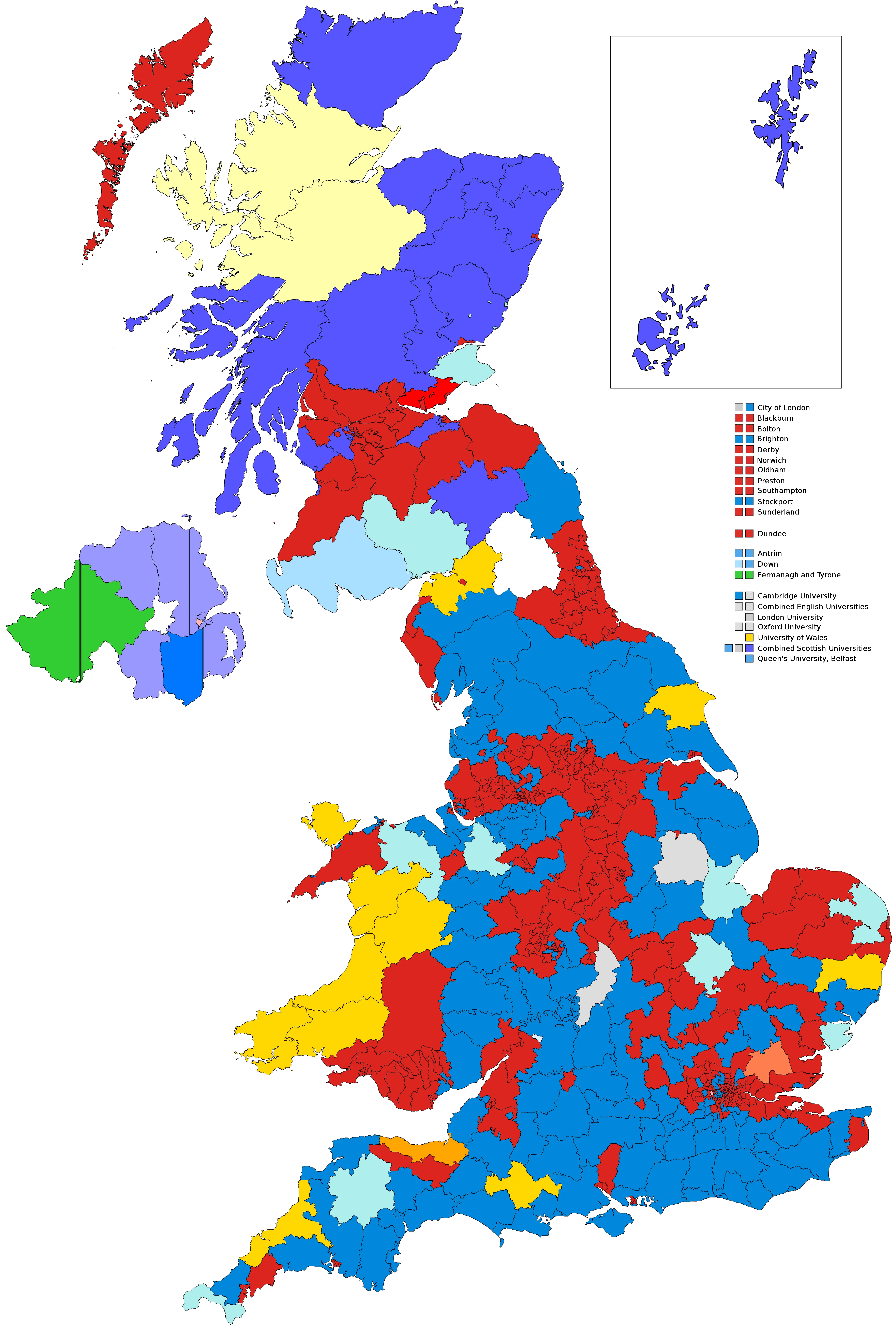 Conservative 186 Dundee (one of two), Kelvingrove, Dunbartonshire†, Lanark, Lanarkshire N, Renfrewshire W, Rutherglen, Edinburgh North, Edinburgh Central, Midlothian S & Peebles, Berwick & Haddington, Bedford, Reading, Buckingham, Wycombe, Cambridge, Cambridgeshire, Birkenhead West, Crewe, Stalybridge and Hyde, Penryn and Falmouth, Carlisle, Derby (one of two), Belper, Derbyshire South, Derbyshire West,[lower-alpha 2] Sutton, Darlington, Stockton-on-Tees, Sunderland (one of two), The Hartlepools, Leyton East, Colchester, East Ham N, Epping, Essex SE, Ilford N (from Ilford), Maldon,[lower-alpha 3] Walthamstow E, Bristol Central, Gloucester, Stroud, Thornbury, Portsmouth Central, Portsmouth North, Southampton (one of two), Winchester, Dudley, Kidderminster, Stourbridge, Hitchin, St Albans, Watford, Kingston upon Hull North West, Kingston upon Hull South West, Chatham, Chislehurst, Dartford†, Dover, Faversham, Gillingham, Gravesend, Accrington, Barrow-in-Furness, Blackburn (both seats), Chorley, Clitheroe, Preston (both seats), Rossendale, Bolton (both seats), Eccles, Heywood and Radcliffe, Blackley, Manchester Exchange, Hulme, Moss Side, Rusholme, Oldham (one of two), Salford North, Salford South, Salford West, Stretford, Bootle, Edge Hill, Liverpool Exchange, Fairfield, Kirkdale, Walton, Warrington, Widnes, Harborough, Leicester East, Leicester South, Loughborough, Grimsby, Lincoln, Balham and Tooting, Battersea South, Brixton, Camberwell North-West, Clapham, Dulwich, Fulham East, Greenwich, Hackney North, Hammersmith South, Islington East, Kensington North, Lewisham East, Lewisham West, Norwood, Paddington North, Fulham West†, Islington North†, Kennington†, Peckham†, St Pancras North, St Pancras South East, St Pancras South West, Stoke Newington, Wandsworth Central†, Woolwich West, Ealing West, Enfield, Harrow East, Spelthorne, Uxbridge, Willesden East, King's Lynn, Norfolk North, Norfolk South, Norfolk South West, Norwich (one of two), Kettering, Northampton, Peterborough, Wellingborough, Newcastle upon Tyne Central, Newcastle upon Tyne West, Tynemouth, Wallsend, Wansbeck, Nottingham Central, Nottingham East, Rushcliffe, The Wrekin, Frome, Taunton, Burton, Smethwick, Stafford, Bilston, Wolverhampton West, Ipswich†, Lowestoft, Sudbury, Croydon South, Mitcham, Wimbledon, Duddeston, Coventry East (replaced Coventry), Aston, Deritend, Erdington, King's Norton, Ladywood, Yardley, Sparkbrook, Birmingham West, Swindon, York, Cleveland, Leeds North East, Sheffield Central, Bradford North, Sowerby, Elland, Leeds West, Halifax, Bradford East, Newport, Llandaff & Barry, Cardiff E,[lower-alpha 4] Cardiff S