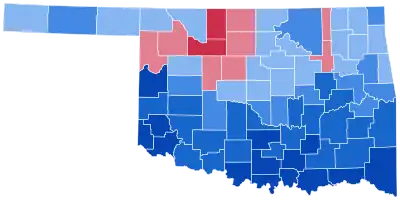 Up to this election, Oklahoma was a reliably Democratic state, with the party winning all but two of the first eleven presidential elections in the state. However, like other states in this Solid South, Oklahoma has since become a Republican bastion. In Dwight D. Eisenhower's landslide elections of 1952 and 1956, Adlai Stevenson II lost every antebellum free-soil or postbellum state, however Oklahoma remained more Democratic than the nation as a whole.[2] In 1960, John F. Kennedy lost most postbellum states, including Oklahoma, due to anti-Catholic sentiment.[3] In 1964, Lyndon Johnson became the last Democratic presidential candidate to carry the state,[4] with only Jimmy Carter in 1976 subsequently reaching even 45% of the vote, and no Democrat after 2000 reaching 35% of the vote or even winning a single county in the state.[5]