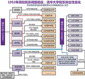 The 1952 reorganisation of Chinese higher education[1][2] (Chinese: 1952年中国高等院校院系调整) was a national policy under the Chinese Communist Party (CCP), which came into power in 1949, to adopt Soviet-styled higher education, which focused more on engineering education and technical training, in mainland China and to remove American influences among Chinese scholars.[3] While eliminating private education, especially missionary higher education, the policy led to the state control over the higher education sector and the loss of faculty governance tradition since the 1920s. This served the Communist agenda to break up the prestigious universities established under the Republic of China, to weaken the historical ties between the university and the faculty, and to establish the political and organisational authority of the new Communist government over the higher education system.[4] The reorganisation involved most of the higher education institutions in mainland China and influenced the basic structure of Chinese higher education today.