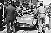 Now Moss and Jenkinson were on the final stage from Cremona to Brescia, however there was no letting up as Moss would bring the Mercedes up to 170 mph for a quick finale. At the finish, fêted by the Italian fans and surrounded by their team, the Englishmen discovered just how successful they had been. They had won the Mille Miglia, and had left all records shattered in the wake of their victorious 300SLR. In second place came Fangio driving alone in the only other 300SLR to finish 32 minutes behind. Third was the Ferrari 376 S of Umberto Maglioli/Gino Monetferrario and fourth Francesco Giardini’s 2-litre Maserati A6GCS. Moss and Jenkinson reached Brescia at 17:29; 10 hours and 7 minutes after they left Brescia at 07:22. Moss became the first and only Briton and one of the few non-Italians to win the Mille Miglia. Moss also won the Index of Performance, normally won by the smaller capacity cars.[4][5][6][7]