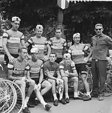 The 1960 Tour de France was run in the national team format. The four most important cycling nations of the time, Spain, Belgium, France and Italy, each sent a national team with fourteen cyclists. There were also five smaller national teams: a combined Luxembourg/Swiss team, a Dutch team, a West German team, a British team, and a team of Internationals cyclists, all with eight cyclists. Finally, there were five regional teams, also of eight cyclists each. Altogether, 128 cyclists started the race.[1] The West German team, that had been away from the Tour since 1938, was allowed to join again.[2]