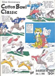 The 1961 Cotton Bowl Classic was the 25th edition of the college football bowl game, played at the Cotton Bowl in Dallas, Texas, on Monday, January 2. Part of the 1960–61 bowl game season, it matched two conference champions, the seventh-ranked Arkansas Razorbacks of the Southwest Conference (SWC), and the #10 Duke Blue Devils of the Atlantic Coast Conference (ACC).[2][3] With a late score, underdog Duke won 7–6, in front of 74,000 spectators.[4][5][6][7]